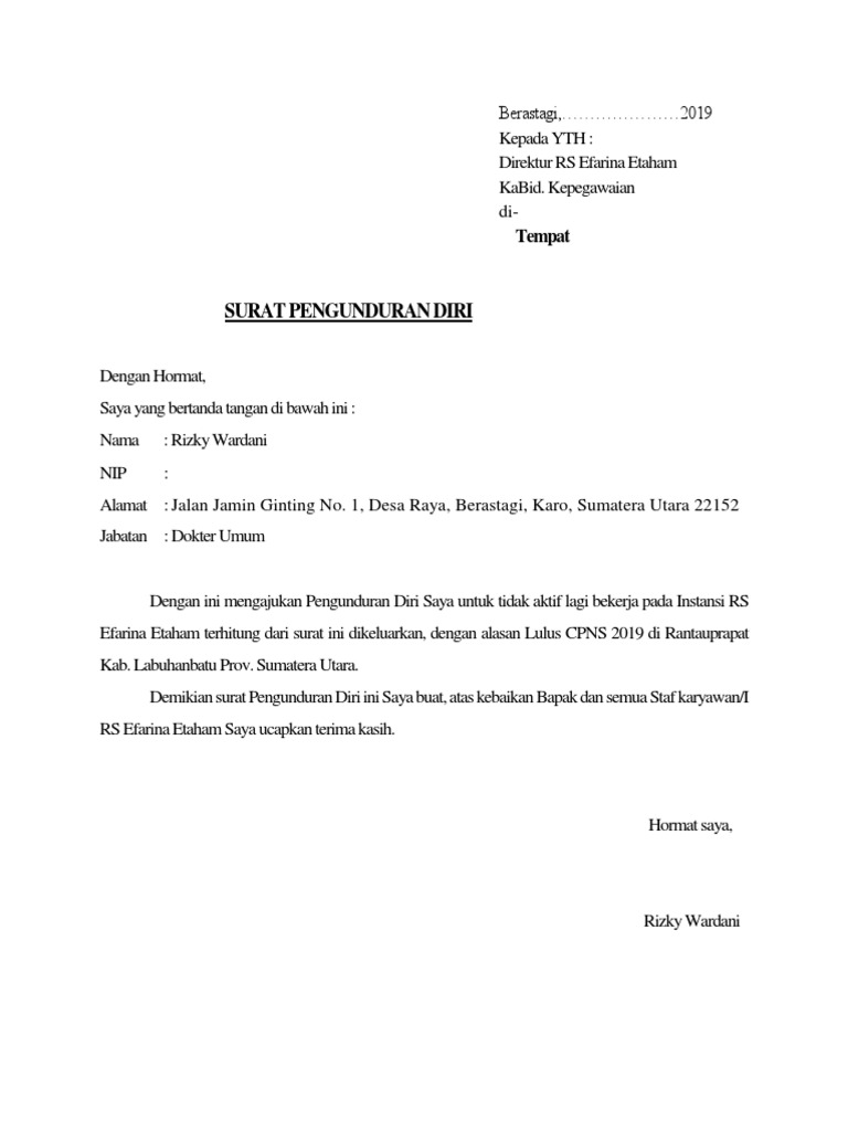 Untuk kop suratnya kamu bisa minta ke. Surat pengunduran diri merupakan sebuah surat yang dibuat dimana di dalam surat tersebut berisi informasi bahwa anda ingin resign atau mengundurkan diri dari jabatan yang surat pengunduran diri. Kepada yth, ketua koperasi pegawai negeri al hidayah di tempat. Contoh surat pengunduran diri dari jabatan. Itulah contoh surat pengunduran diri dari sekolah.