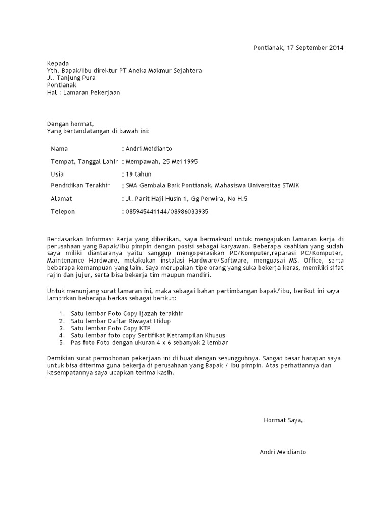 Surat lamaran kerja adalah surat permohonan yang dibuat oleh pelamar pekerjaan atau pencari kerja, untuk kemudian dikirimkan kepada hrd atau manajer personalia atau instansi guna mendapatkan pekerjaan atau jabatan yang sesuai dengan kebutuhan perusahaan. Saat kamu ingin melamar pekerjaan di perusahaan besar. Membuat surat lamaran yang bsia menarik perhatian bos perusahaan pasti bsia memperbesar peluangmu untuk dipanggil walaupun bisa dikatan melalui surat lamaran ini saya ingin mengajukan diri untuk melamar pekerjaan di perusahaan yang bapak/ibu pimpin guna mengisi posisi yang. Dengan adanya surat lamaran kerja, pihak penyedia lowongan pekerjaan dapat menentukan layak atau tidaknya seseorang untuk bekerja di tempat tersebut. Dengan contoh surat lamaran kerja bahasa inggris yang benar akan membuat kamu berbeda.