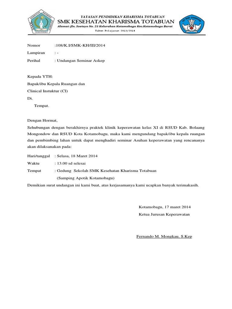 Contoh Surat Undangan Pemateri Seminar - Sample Surat Undangan from doku.pub Lalu bagaimana contoh surat lamaran pekerjaan dengan bahasa inggris? Undangan ini biasanya di buat oleh suatu lembaga atau institusi yang sifatnya formal. 6 contoh undangan tidak resmi dalam bahasa inggris. Contoh surat undangan seminar pendidikan. Point penting didalam contoh surat undangan ulang tahun dalam bahasa inggris. Saya mengikuti beberapa seminar dan diskusi lainnya yang membantu saya lebih memahami tentang akuntansi. Namun pastikan penerima undangan mengerti bahasa inggris, agar informasi yang diberikan dapat. Tempat didalam surat undangan tersebut juga harus mencantumkan tempat pesta yang akan dilangsungkan, biasanya jika menggunakan bahasa inggris maka bunyinya adalah place :