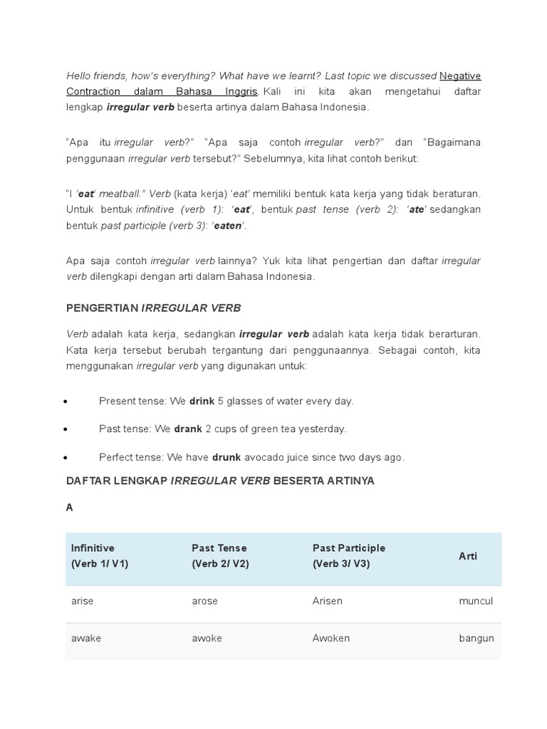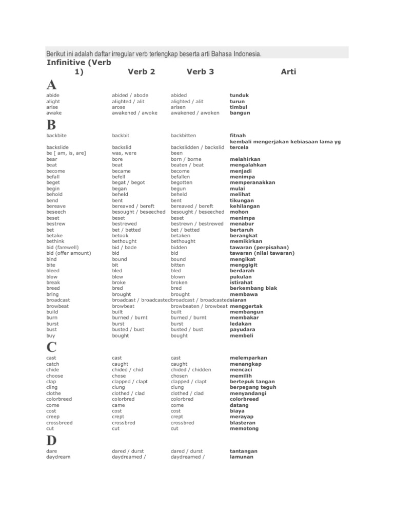 Contoh Kalimat Irregular Verb Beserta Artinya - 1 / Demikian pembahasan mengenai irregular verb beserta artinya, semoga bermanfaat dan menambah wawasan anda dalam mempelajari kata kerja tidak beraturan.. Semoga sahabat kbi dapat menjadika referensi belajar. Berikut ini beberapa contoh irregular verb beserta artinya yang digunakan dalam sebuah kalimat. Apa yang di maksud dengan irregular verbs tersebut? Alight (turun) alights berikut daftar irregular verb dan artinya dalam berbagai abjad. Abide (tinggal) abides abode, abided abode;